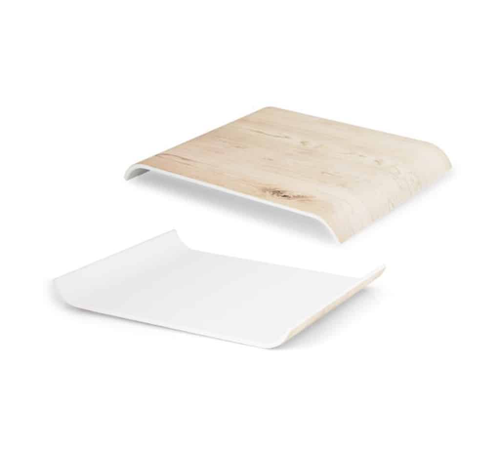 Alzatina/vassoio in melamina bicolor bianco/legno con lati corti curvati, per utilizzo bifacciale.