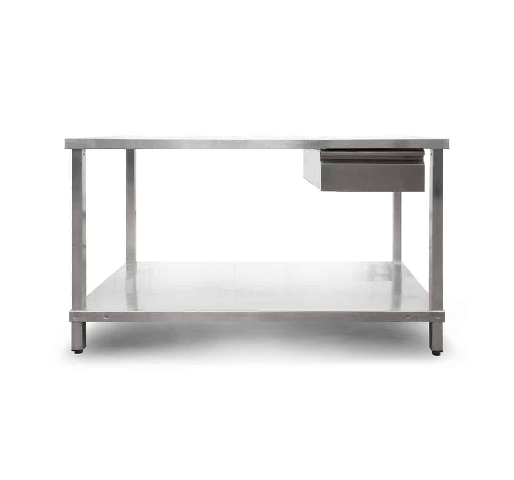 Banco di lavoro in acciaio inox, dotato di ripiano e cassetto.