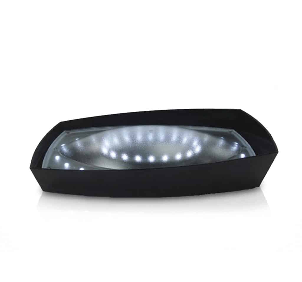 Base d’appoggio luminosa nera dalle linee inclinate, con illuminazione a LED con luce bianca fredda. Compatibile solo con Spumantiera Barca.