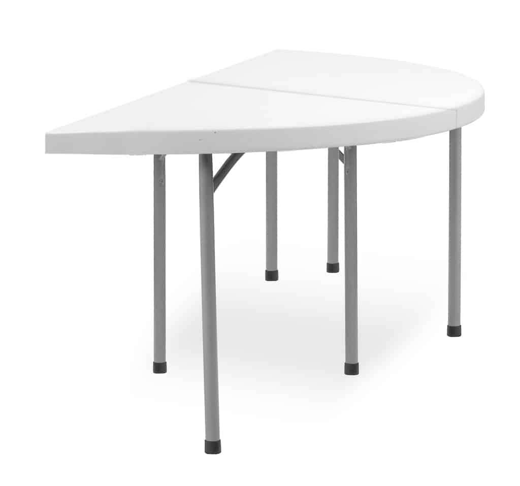 Capotavola a mezzaluna, con basamento pieghevole in acciaio verniciato grigio e piano in polietilene grigio chiaro. Elemento modulare, utilizzabile, con aggancio sul lato corto, insieme a 2 Tavolo Catering 200×90 cm.