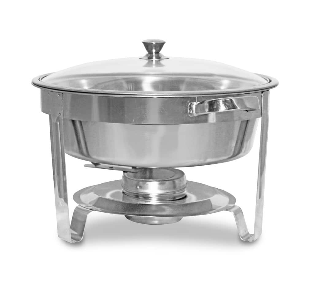 Chafing dish rotondo in acciaio inox, completo di contenitore, coperchio e 1 ricarica di combustibile gel. Possibilità du aggiungere Ricarica chafing dish.