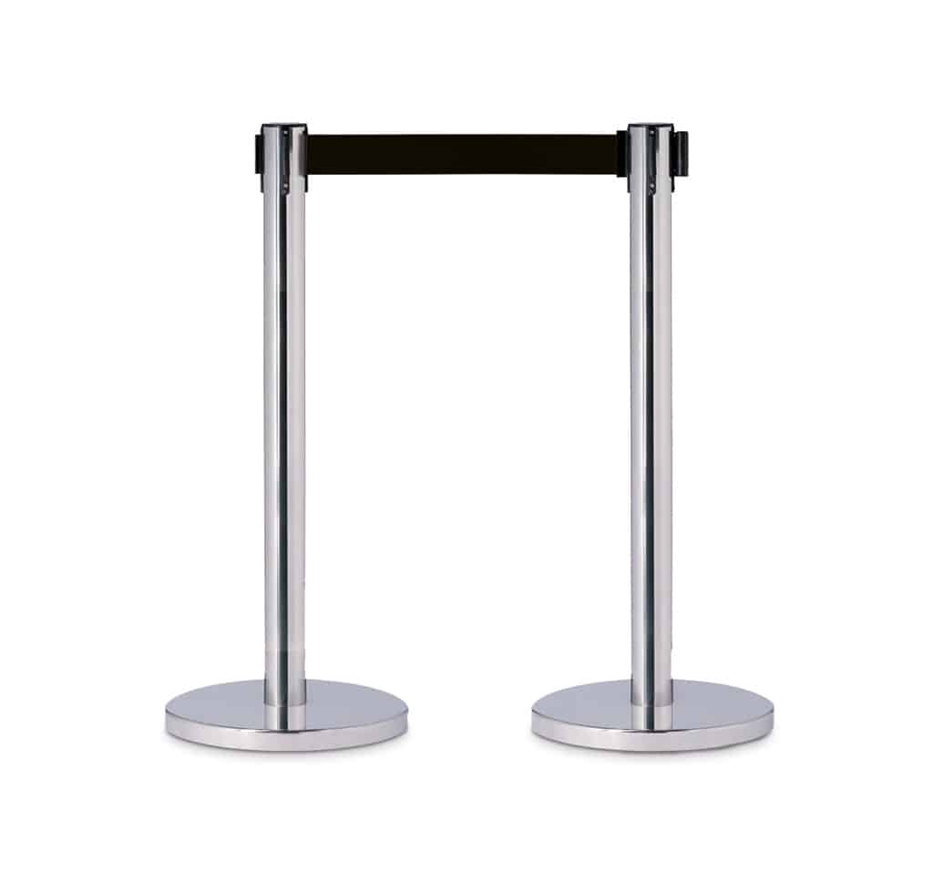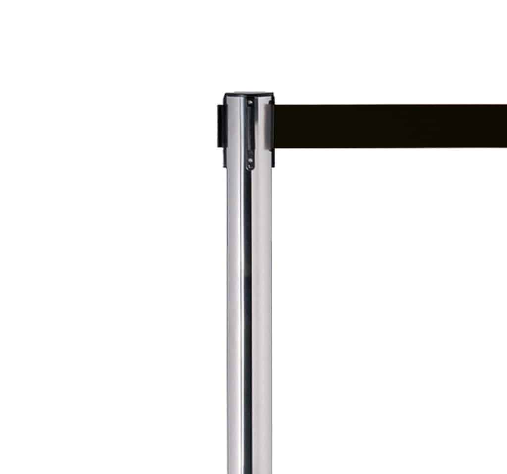 Colonna in acciaio inox con nastro nero, ideale per la delimitazione degli spazi e la creazione di corridoi e corsie.