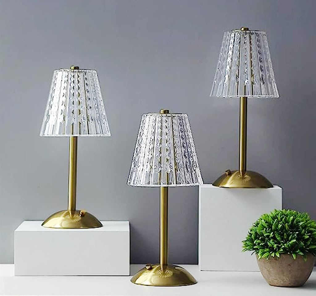Lampada Gemma da tavolo con stelo e base in metallo finitura ottone, paralume in metacrilato, luce a LED bianco regolabile.