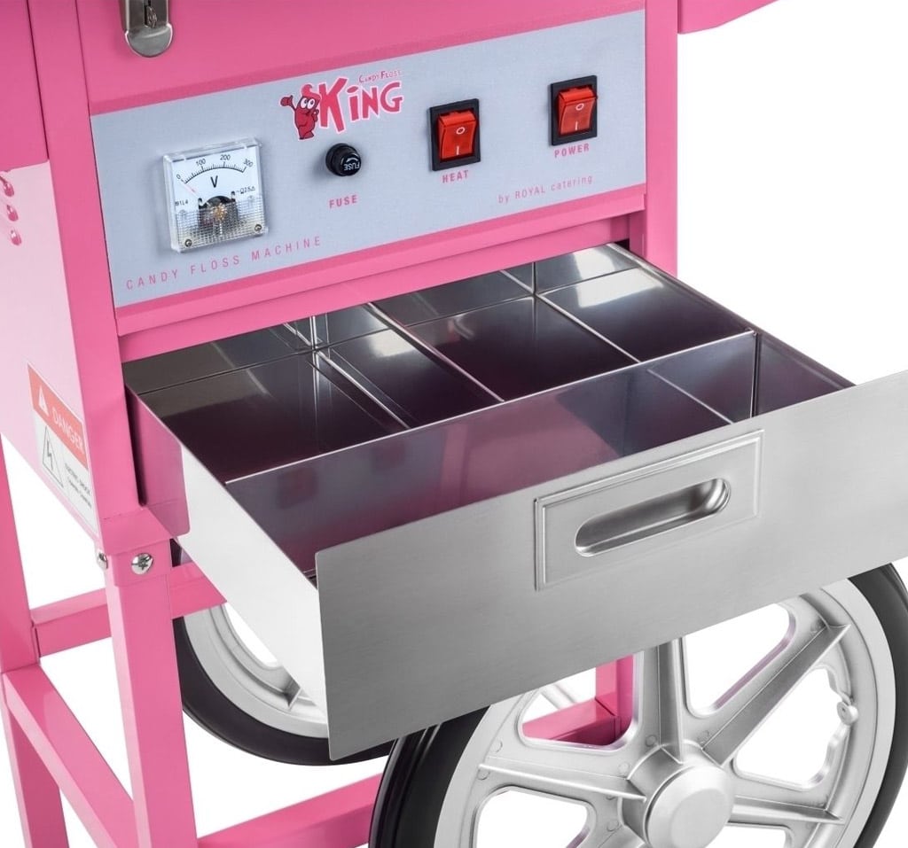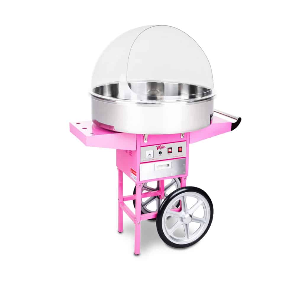 Macchina per zucchero filato con carretto col. rosa e cupola trasparente.