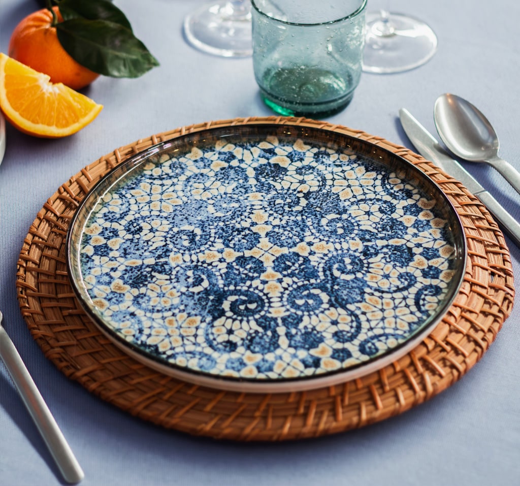 Piatto piano Fez Ø 26 cm in porcellana colorata con decorazione blu, dalla texture materica e motivo geometrico a rosetta al centro.