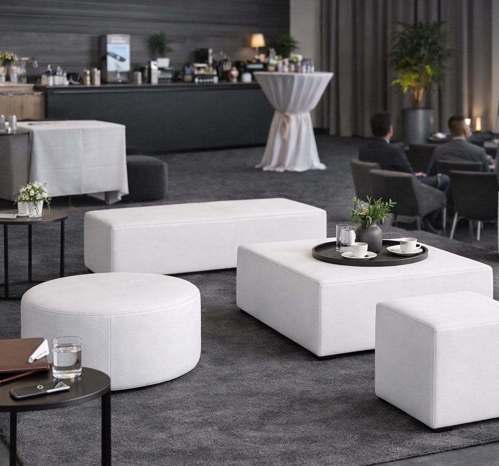 Pouf Smart tondo Ø76 rivestito in ecopelle bianca, dotato di 4 piedini d’appoggio.