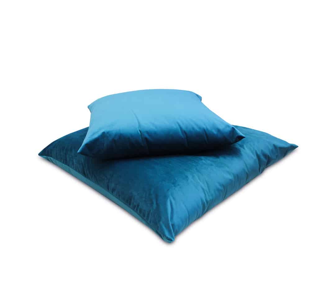 Set da 2 cuscini quadrati di differenti dimensioni rivestiti in velluto ottanio.