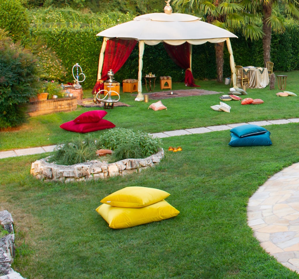 Il cuscino grande misura 100×100 cm, il cuscino piccolo 70×70 cm.