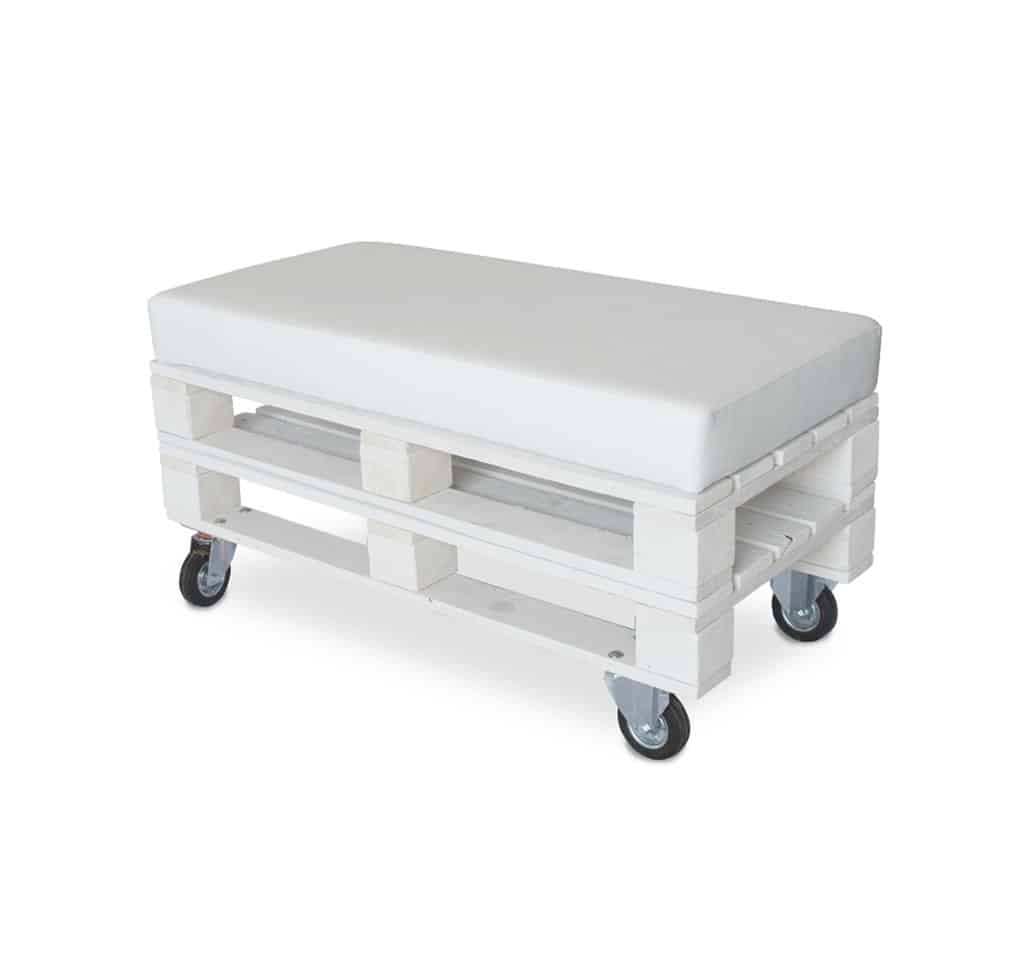 Set Arredopallet in legno verniciato bianco. Composto da 2 panche a 2 posti e 1 tavolino. Dotato di ruote frenanti e 2 cuscini per le panche in tessuto avorio.