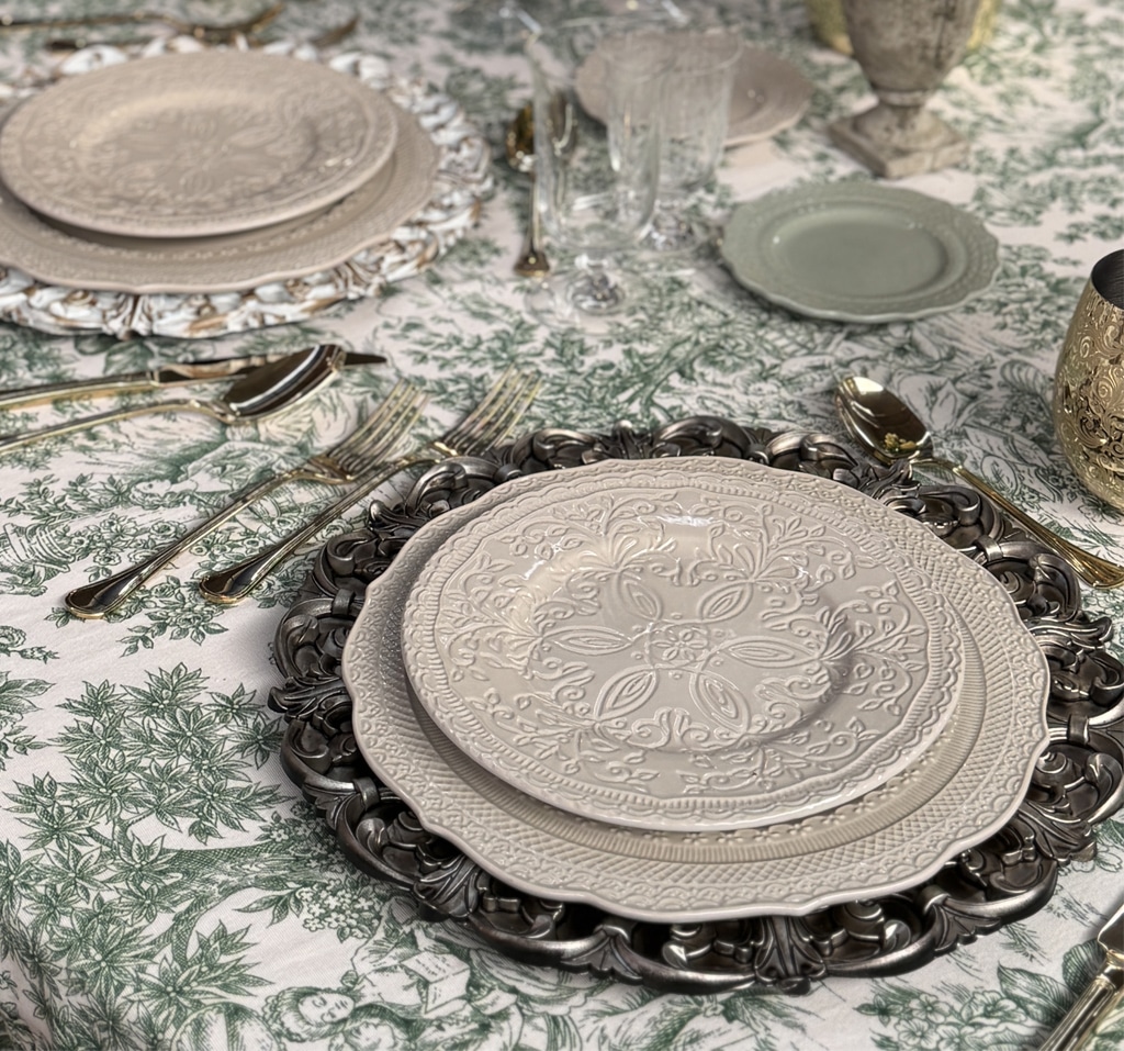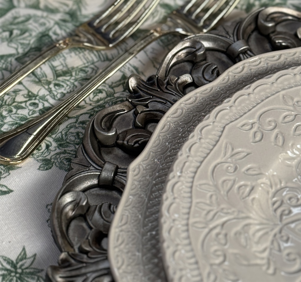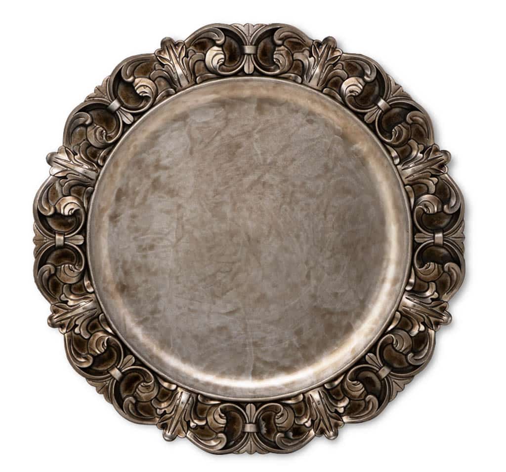 Sottopiatto Rococò Ø 35 cm in polipropilene color bronzo anticato, con bordo decorato e finitura dall’effetto materico.