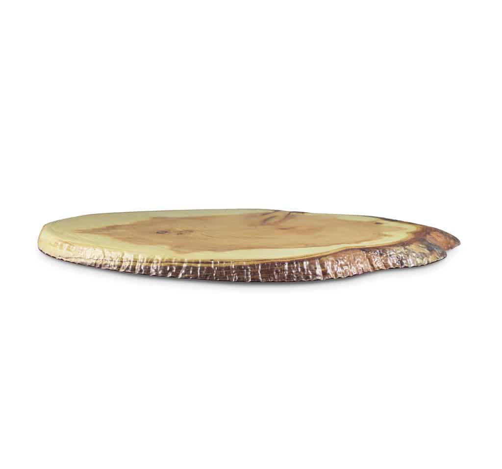 Tagliere ovale in melamina effetto sezione tronco di legno con corteccia, per utilizzo da buffet.