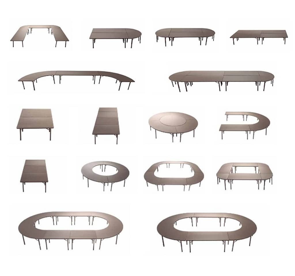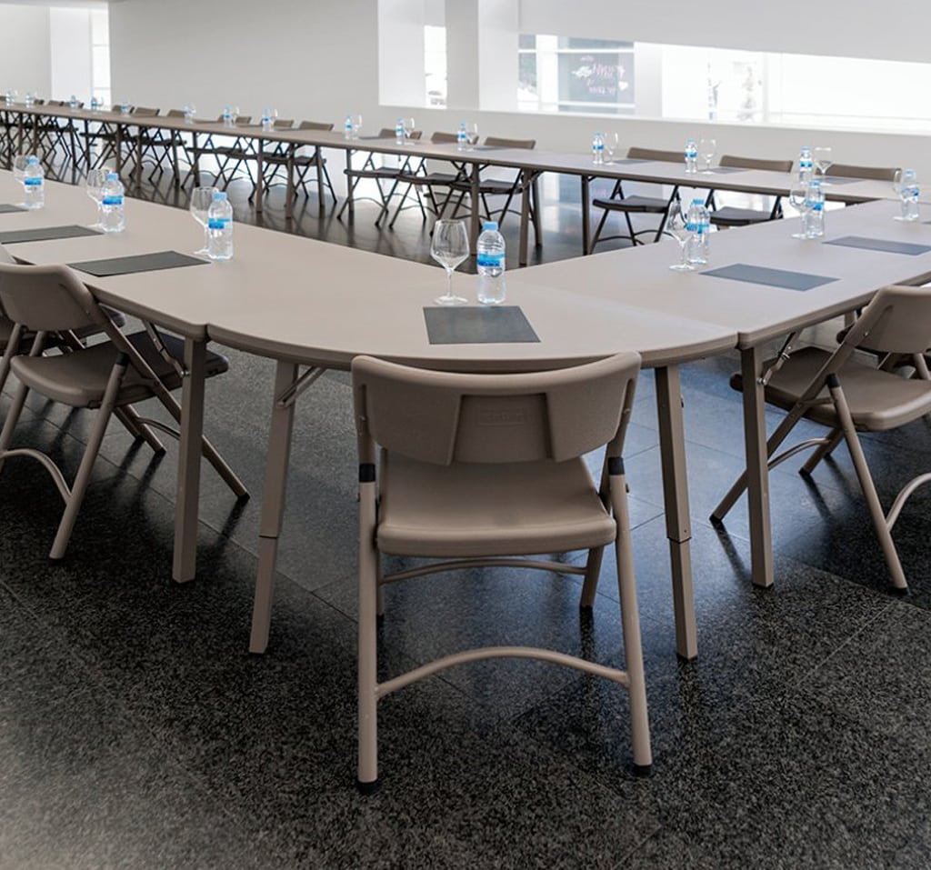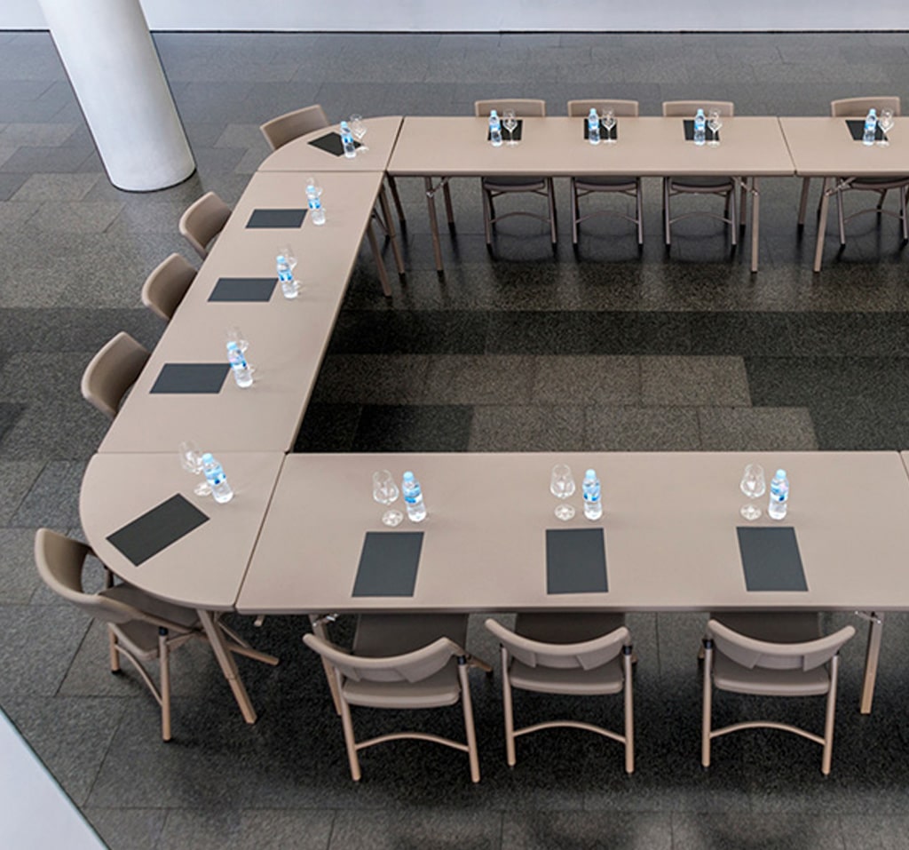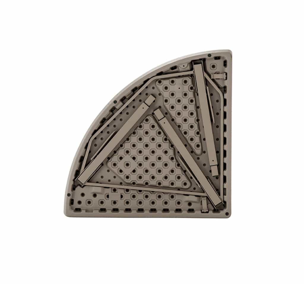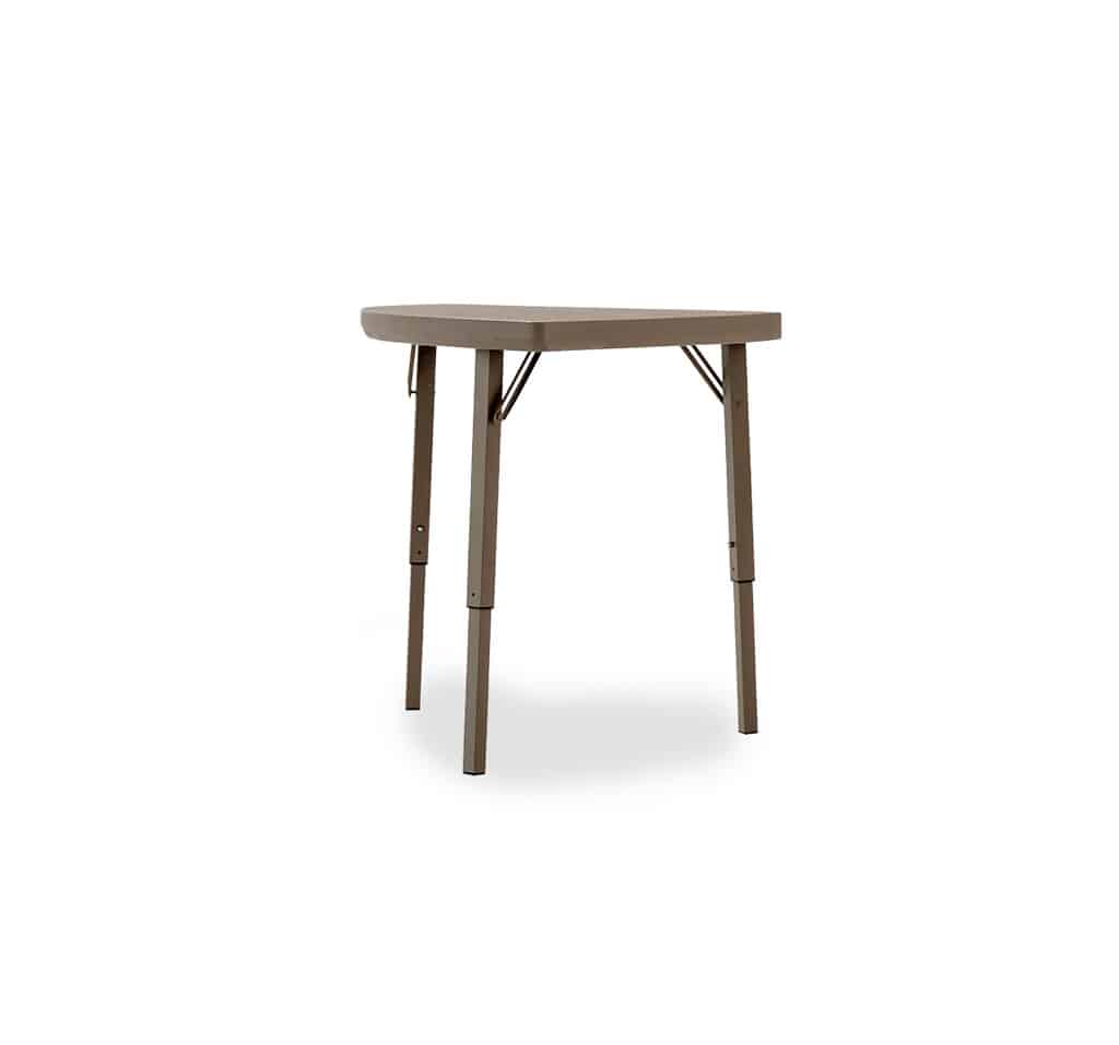 Basamento pieghevole in acciaio verniciato a polvere resistente agli urti e all’umidità e piano in polietilene. Carico massimo consigliato 100 kg; capacità tavolo singolo: 1 persona.