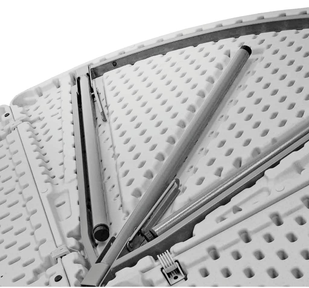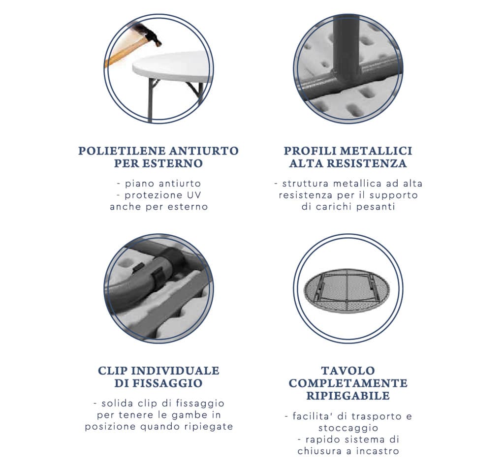 Struttura con verniciatura a polvere resistente agli urti e all’umidità e piano con con protezione anti-uv. Peso massimo consigliato: 350 kg. Capacità tavolo: 10 persone.