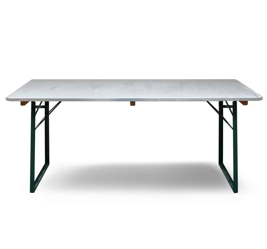 Banco di lavoro con piano in acciaio inox, dotato di gambe pieghevoli.