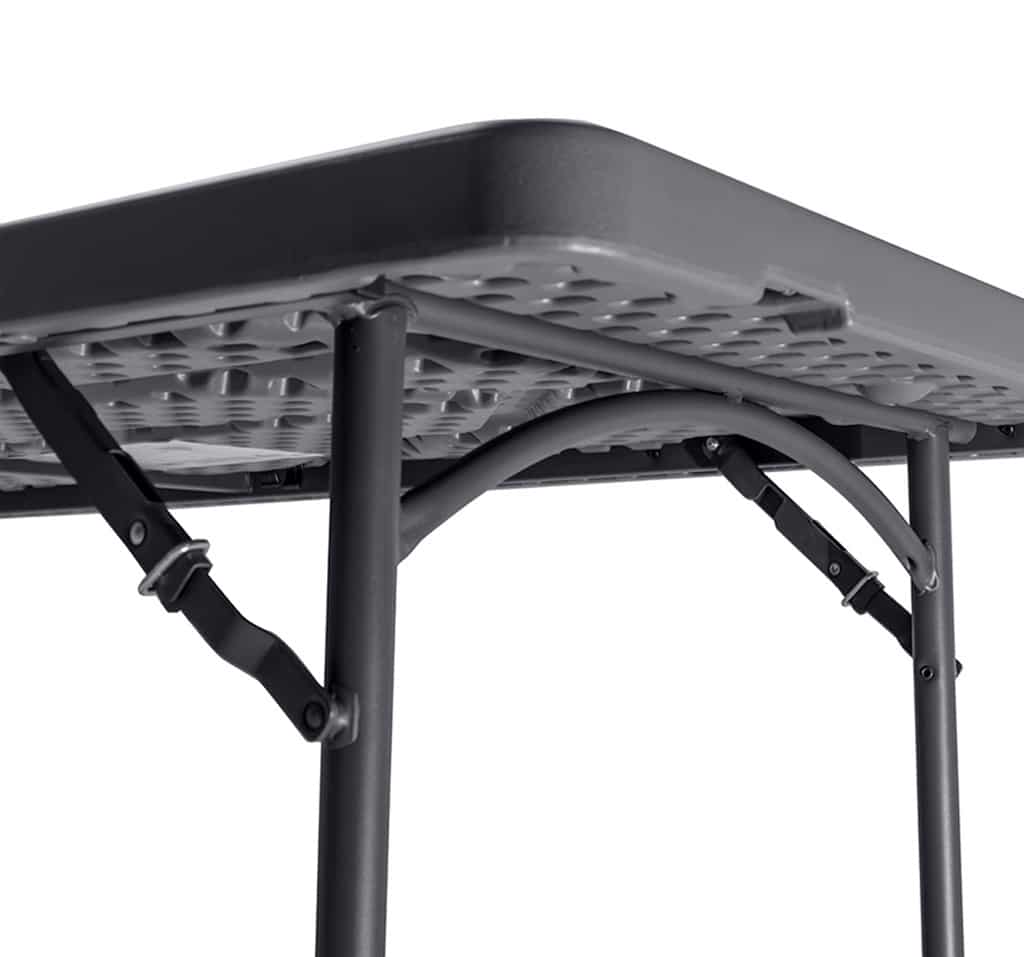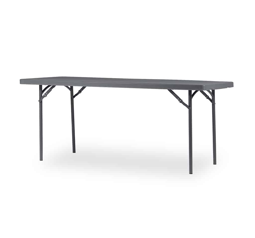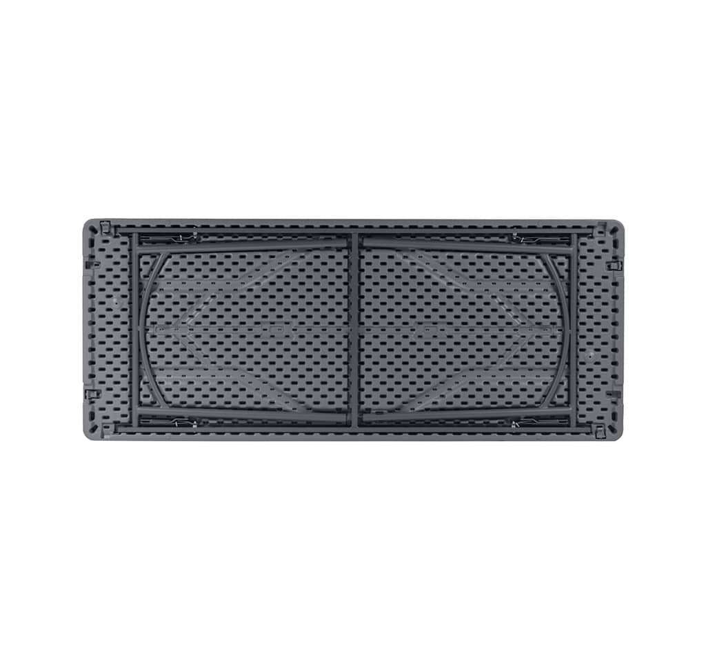 Tavolo Grey rettangolare, con basamento pieghevole in acciaio verniciato grigio antracite e piano in polietilene grigio scuro.